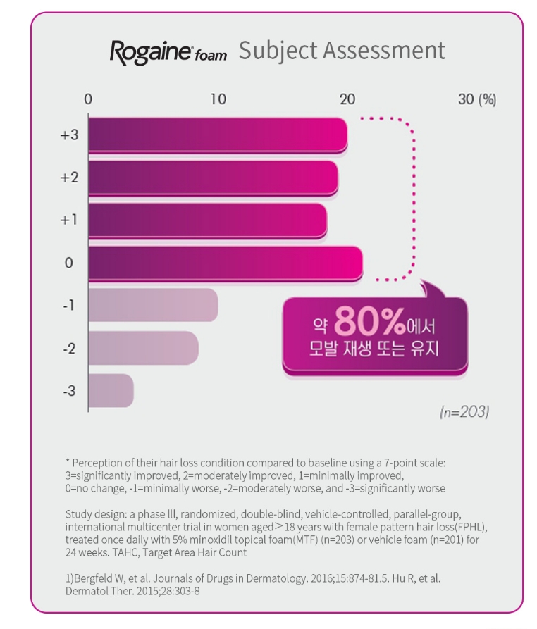 로게인폼은 남녀 모두 사용 가능한 탈모 치료제로, 특히 남성형 탈모증(안드로젠탈모증) 및 여성형 탈모증의 치료에 효과적입니다. FDA 승인을 받은 유일한 외용제이며, 전 세계 15개국에서 판매 1위를 기록하고 있습니다.